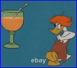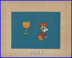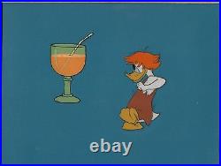 The First Cel is Donald Duck as "Caveman" from: "DONALD AND THE WHEEL". (1961) 17 minute Cartoon Featurette. Released June 21, 1961 to Theaters along with Disney's feature "The Parent Trap" The Second Cel provides a: LARGE GLASS OF ORANGE JUICE WITH STRAW. (From 1962 Walt Disney's "Wonderful World of Color" TV Commercial).Affixed to the back of the matte is the original Disneyland Art Corner Gold Label applied by the Disneyland Art Corner. This "Gold Label" is of the variety that was used at the Disneyland Art Corner from 1962 through 1965. Reasonable offers will be considered. The first cel is of "Caveman" Donald Duck. This cel contains a 3ΒΌ inch high image of Donald from Disney's 17 minute animation featurette, Donald and the Wheel.
